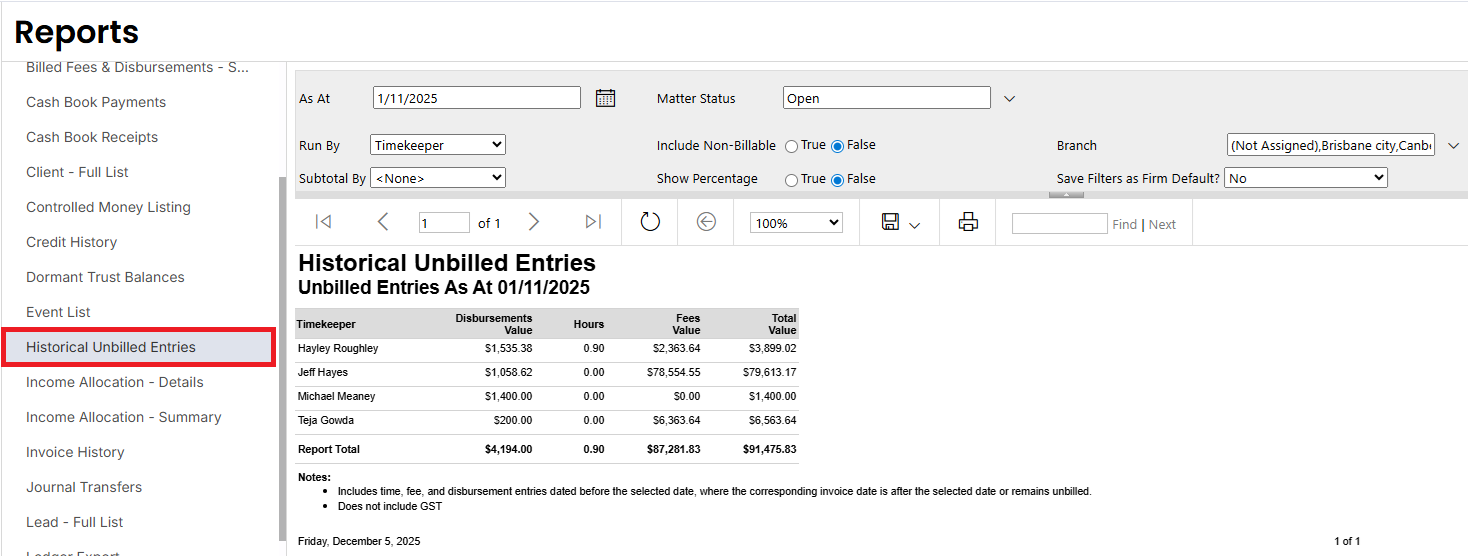 This report shows all unbilled time, fee, and disbursement entries as at a specified date.