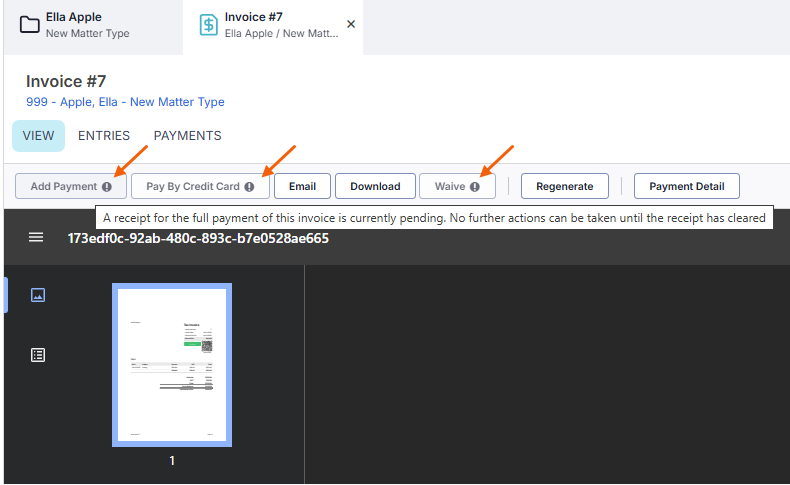 When there is a pending payment for the full amount of the invoice (i.e. it is within its clearance days period), the Add Payment, Pay By Credit Card and Waive buttons will be disabled.