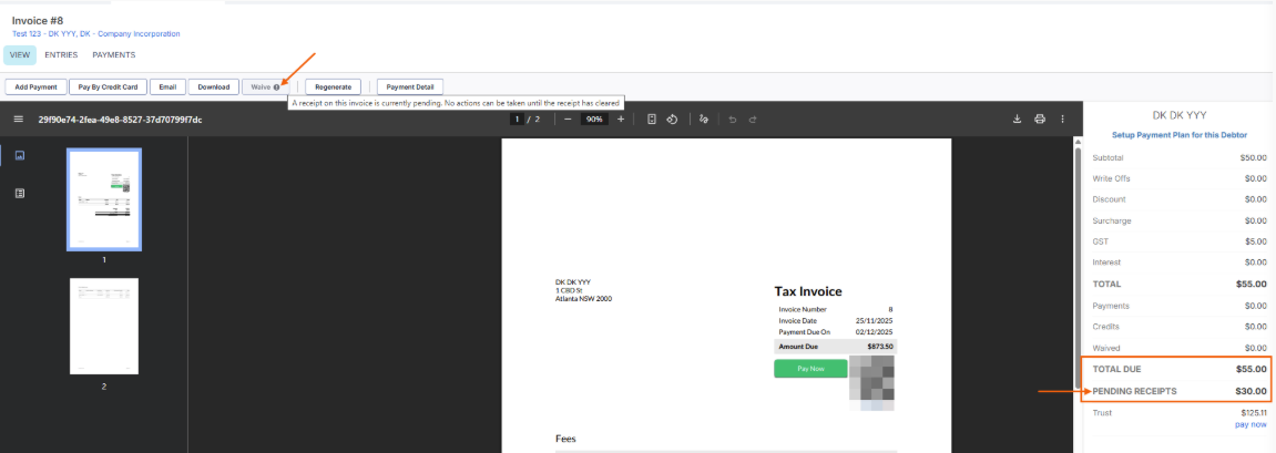 When there is a pending payment for a partial amount of the invoice, the Waive button will be disabled, and the debtor can only pay the remaining balance of the invoice.