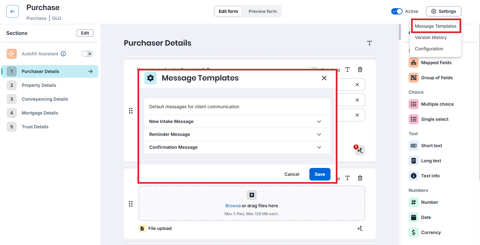 You can now edit the New Intake Message, Reminder Message and form completion Confirmation Message for specific Intake Forms by selecting Settings > Message Templates when you have the form open in the Form Builder.