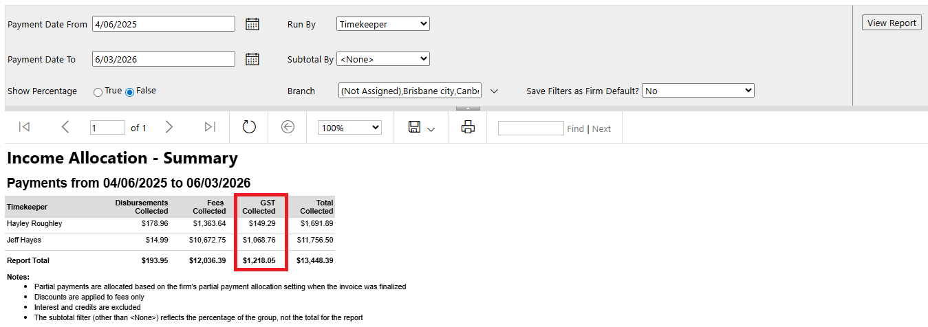 The GST Collected column has been restored when Timekeeper is selected in the Run By or Subtotal By column.