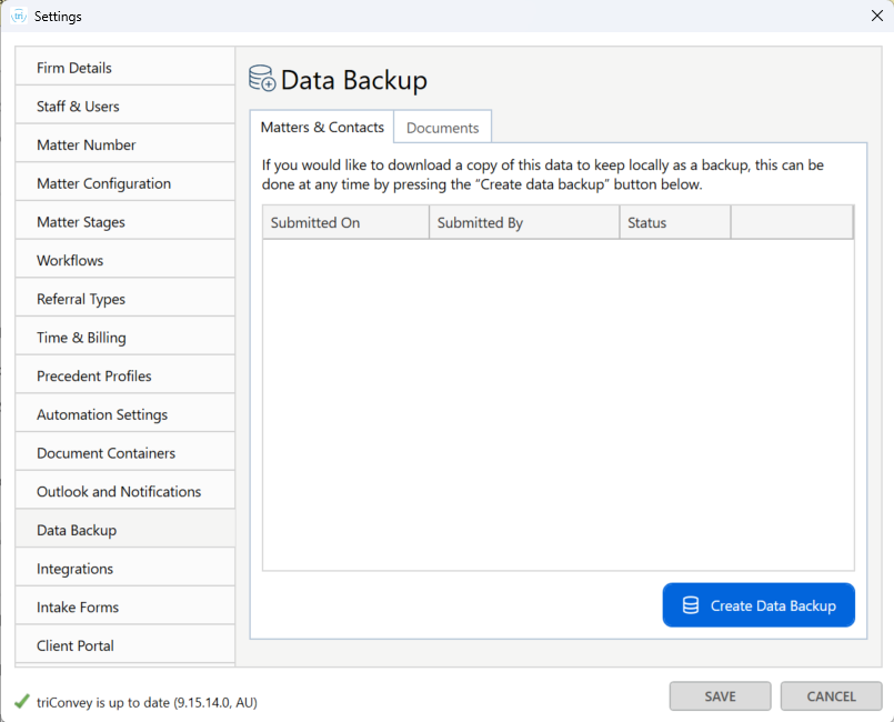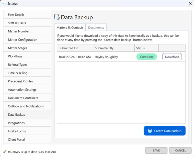 Select Create Data Backup in the Matters & Contacts tab to generate a data backup of your Contacts, Matters and Matter Roles in a .CSV.