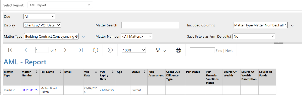 The new AML Report allows you to run a report on clients with VOI data or clients without VOI data. The report columns include:
