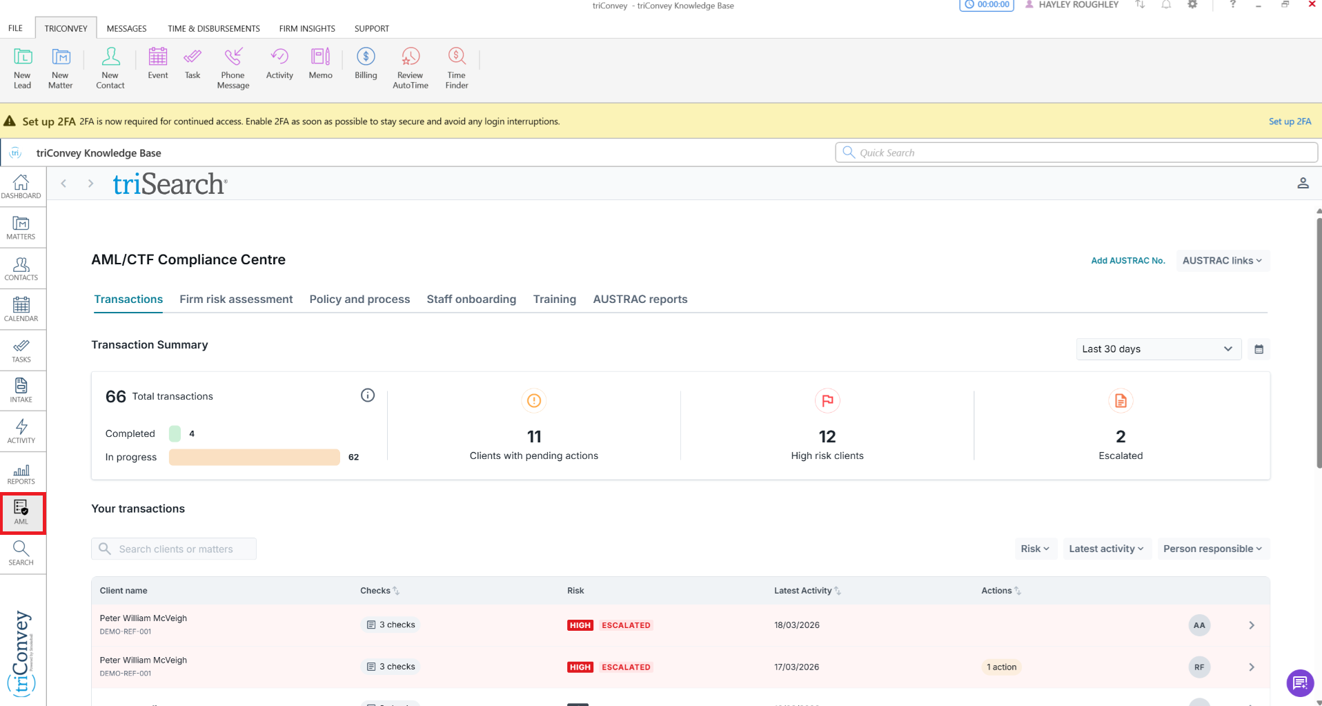 The triSearch AML Compliance Centre is designed for your firm's designated AML Compliance Officer to quickly access a firm-level view of contact risk ratings for compliance purposes. Learn more about the triSearch AML Compliance Centre here.