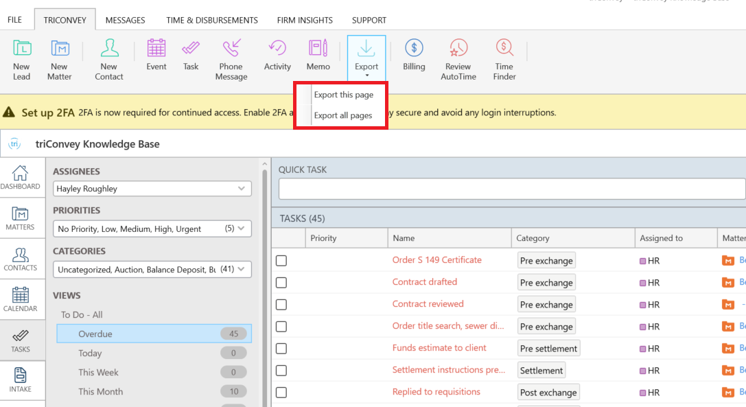 Export all pages exports the full task list into a .CSV file