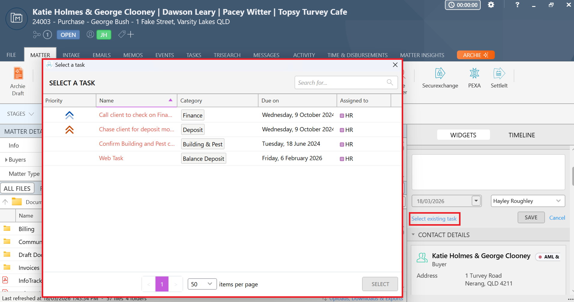 The Next Step section in the Matter Widget has been redesigned, making it easier to select an existing task and view task details.
