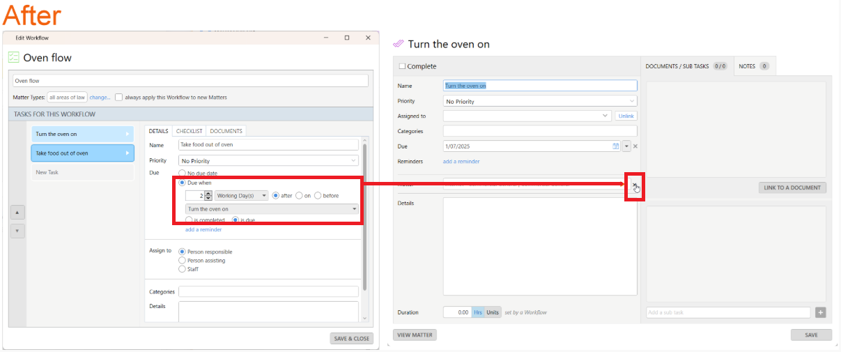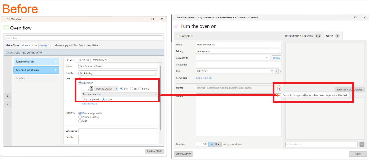 You can now unlink a Workflow Task from a matter when another Workflow Task's due date is linked to its due date or completion date. If this is done, the second Workflow Task will still be linked to the first Workflow Task's due date or completion date.