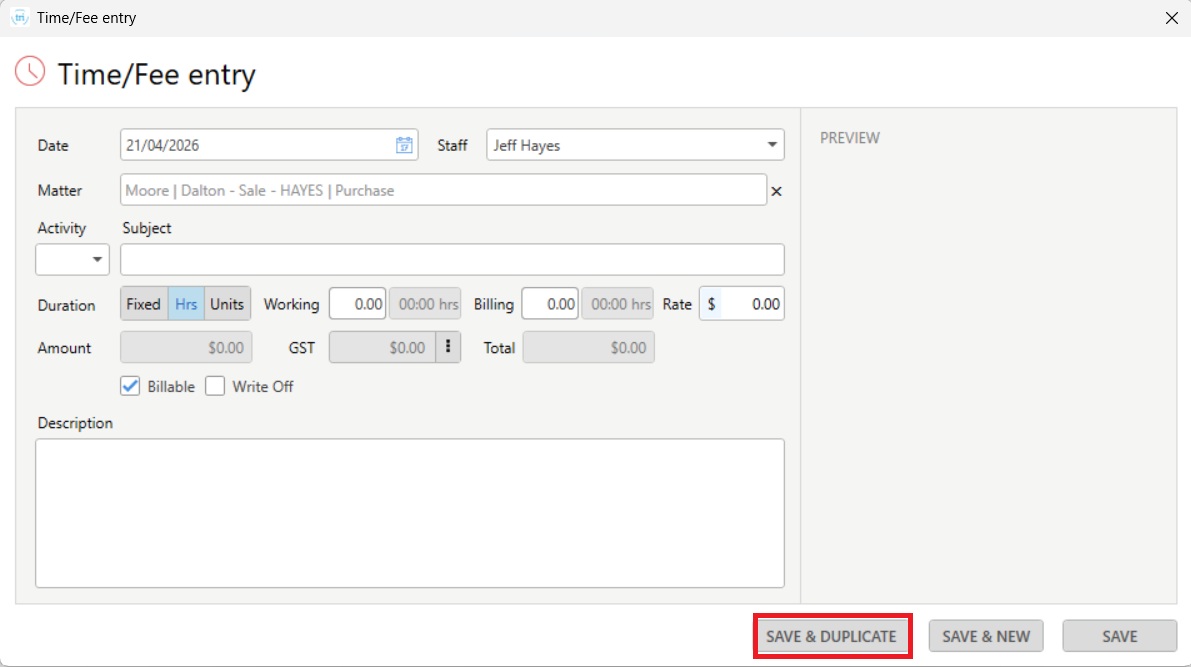 You can now quickly duplicate a time, fee or disbursement entry when you need to record the same or very similar work on another matter.