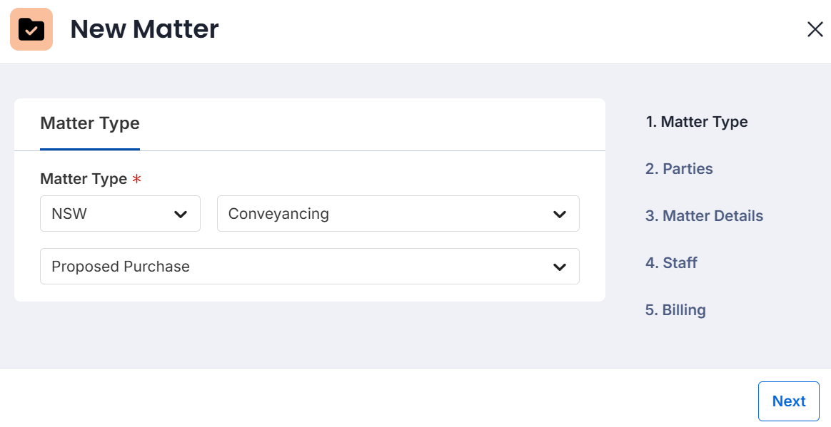 - Refer to Matter Types for State specific instructions on how to finalise creating a new matter.