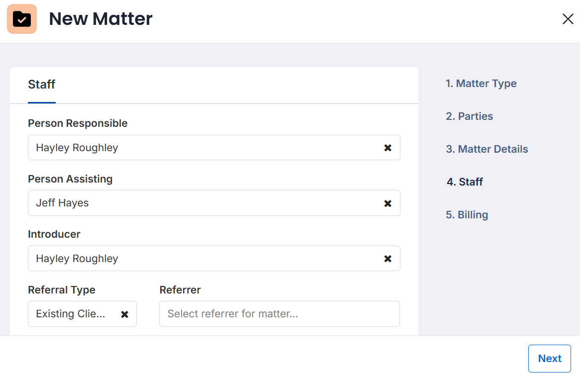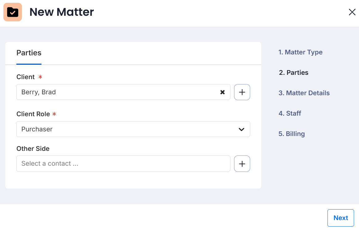 Tip: If there are multiple parties to a matter, select the plus icon to add them.4. Select Next.
