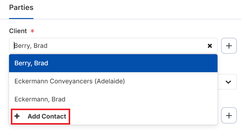 - If your client is a new contact, select +Add Contact.