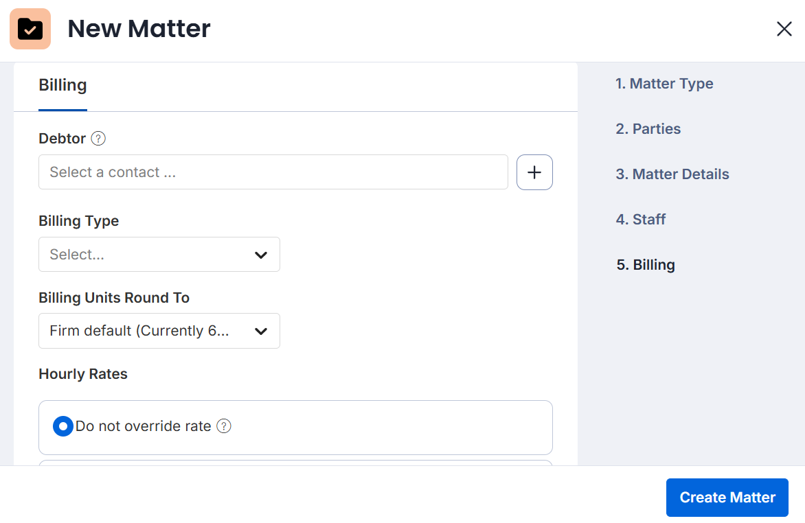 - If you are unsure which matter type to use for a specific matter, reach out to your Account Manager or view our Matter Types for additional best practices.