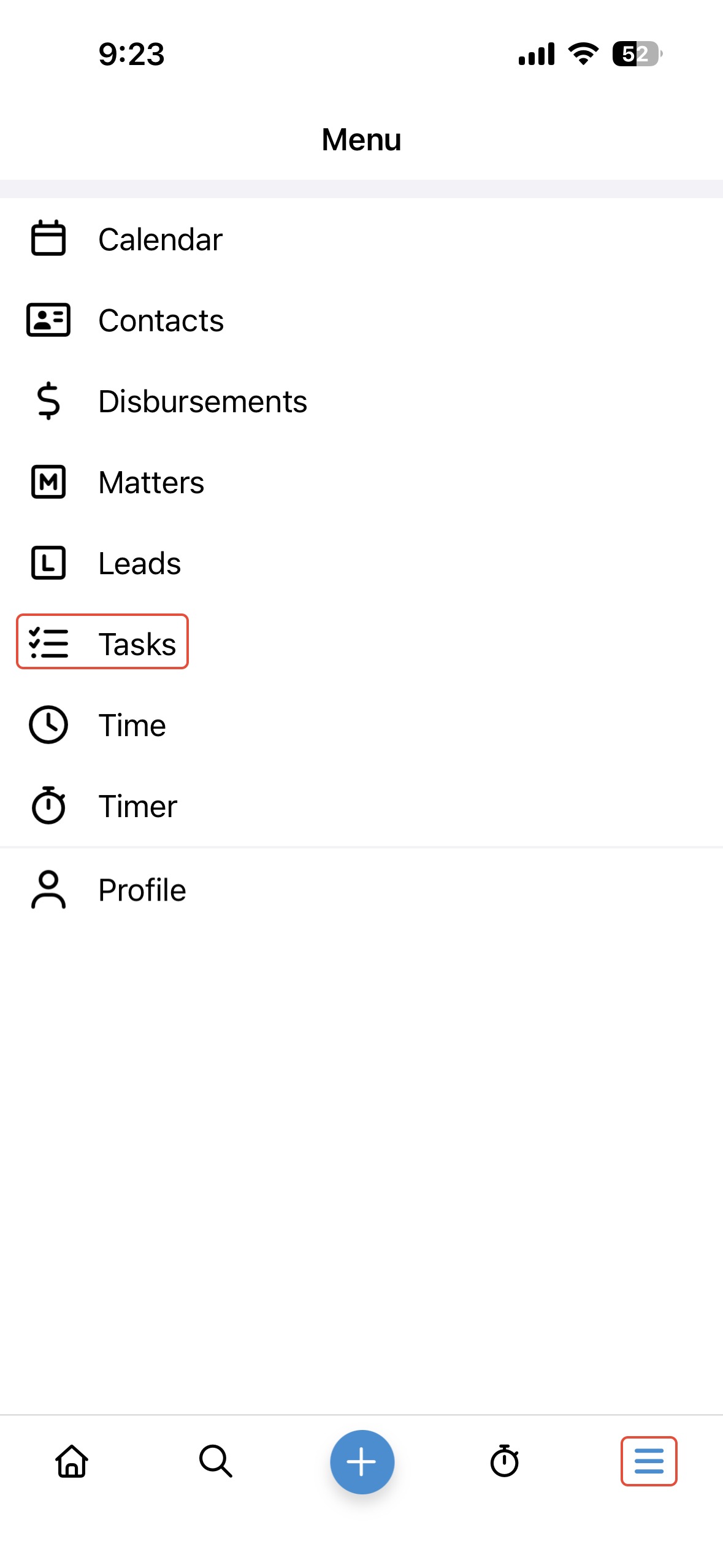To access your tasks, tap the hamburger icon from the bottom-right corner of the screen and then select Tasks.