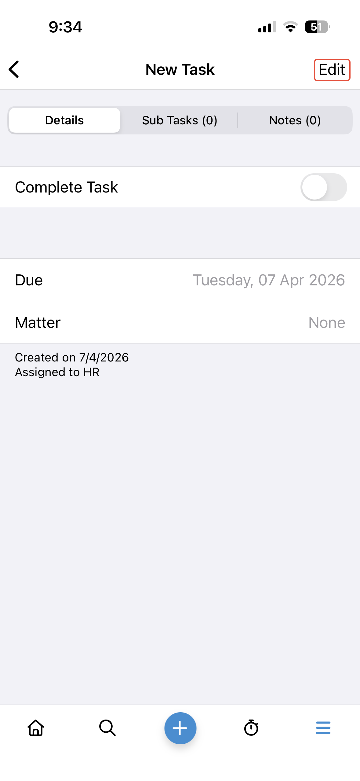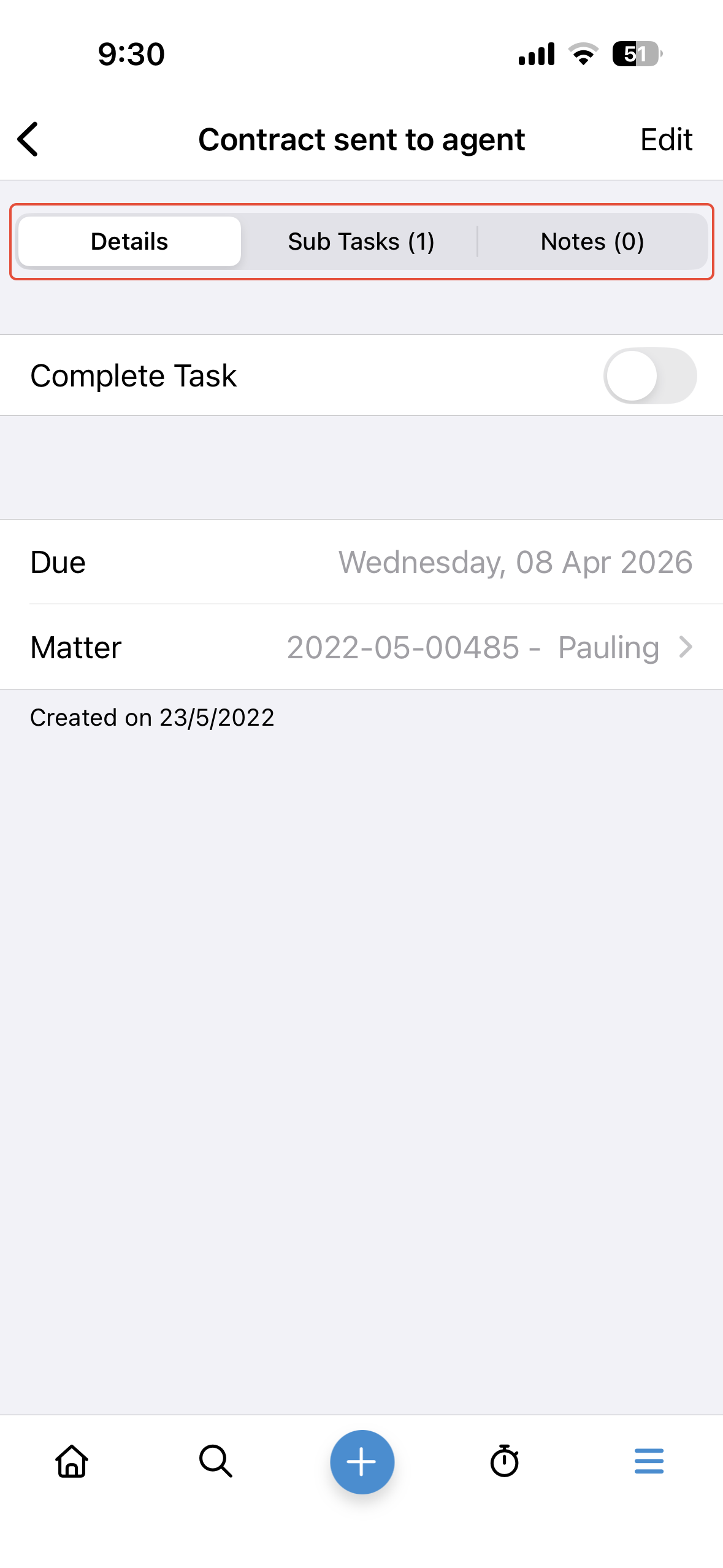 Tapping on a task name shows more details around the task, either entered from the triConvey Desktop App or Mobile App. From this screen, you can also view or add sub tasks and notes.
