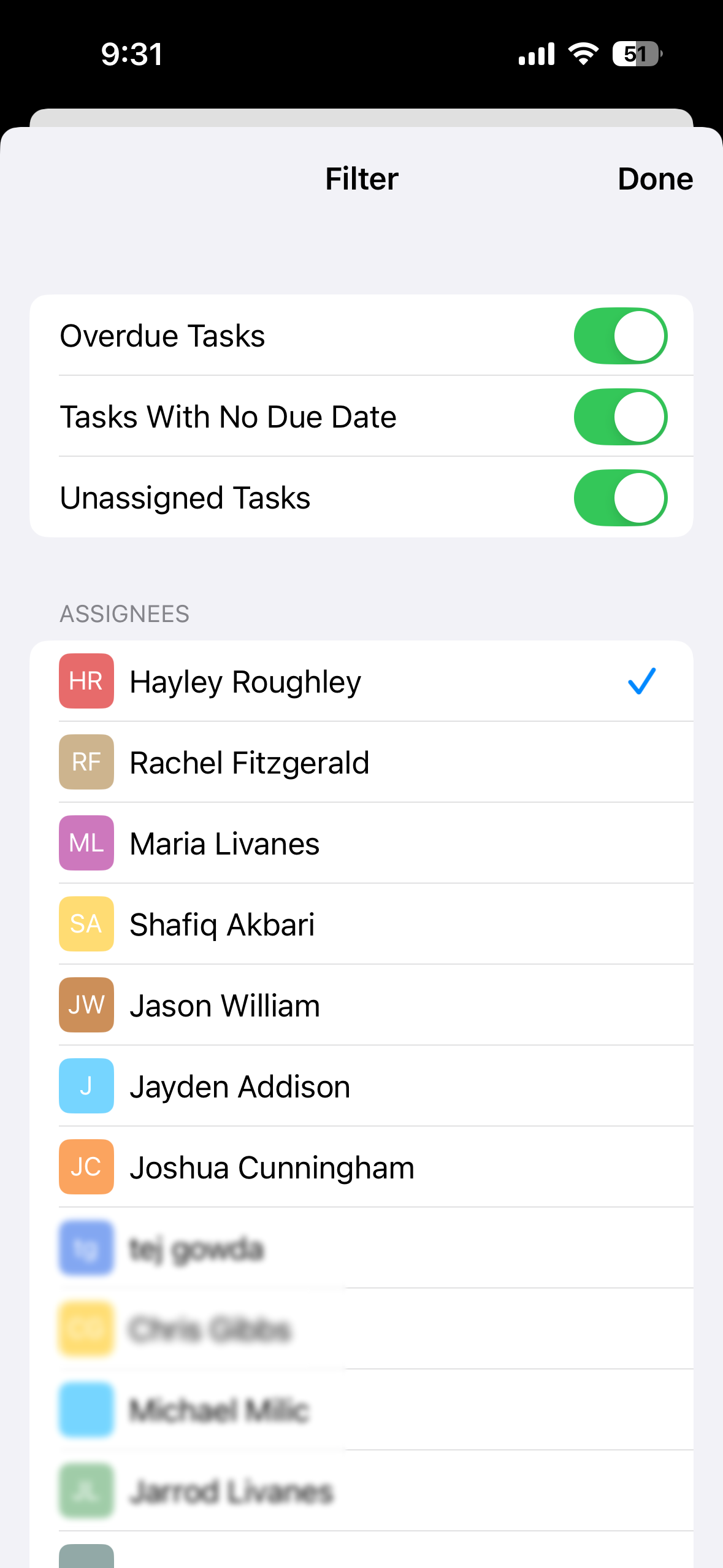 Tick or untick the names of staff members you wish to view or stop viewing tasks for, then select Done.
