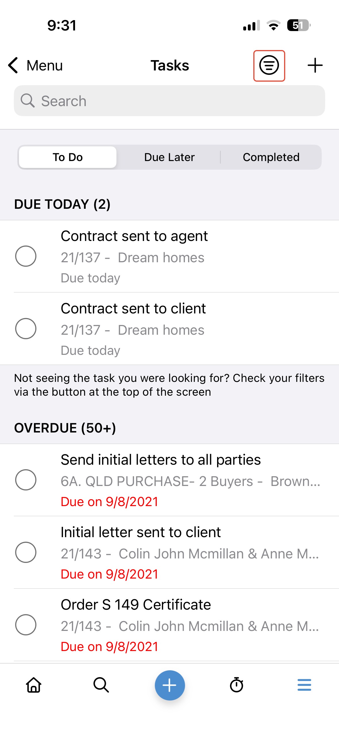 To view tasks owned by specific staff members, select the filter icon on the top-right corner of the main Tasks list.