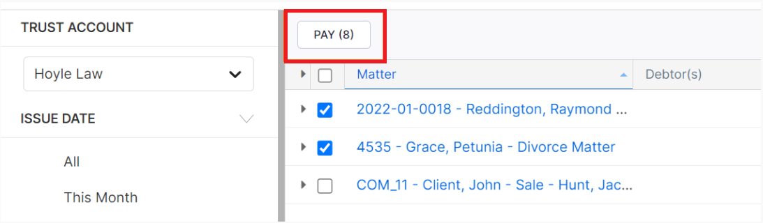Learn how to create a bulk trust payment of invoices on matters that have trust money available.