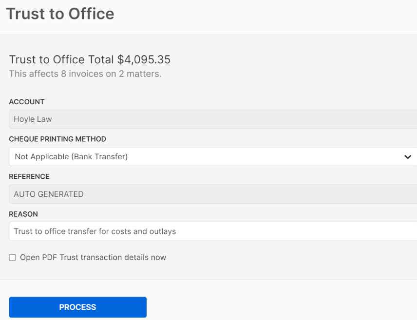 Once the PAY button has been clicked, a Trust to Office window appears with a summary of the transaction including the total amount and the number of invoices and matters affected.