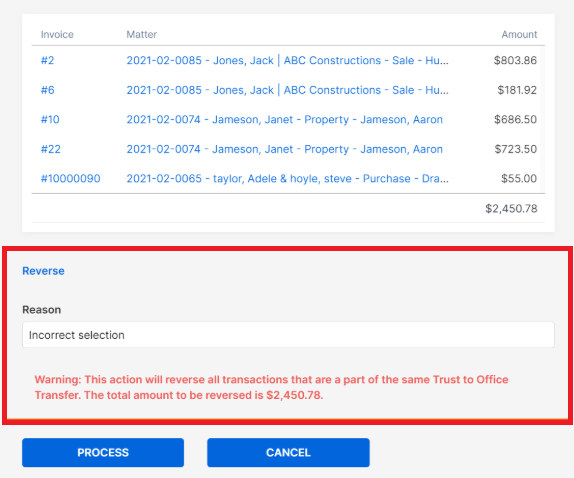 NOTE: If you view the Transaction Details at a matter, contact, or account level, it will still reverse all of the payments that are linked to the Trust to Office transfer.