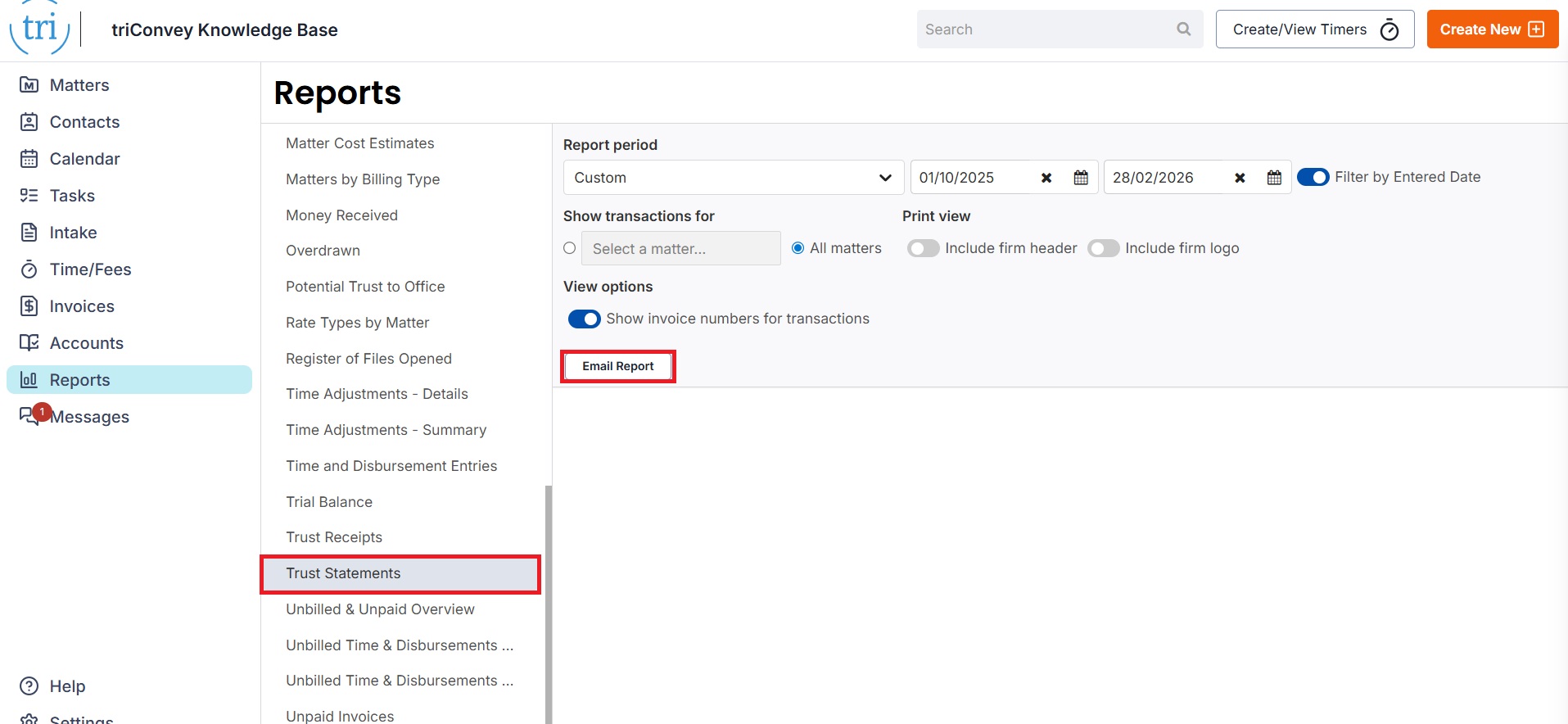 Tip: You can also filter transactions by the date they were entered.4. Once you have selected your filters, click Email Report.