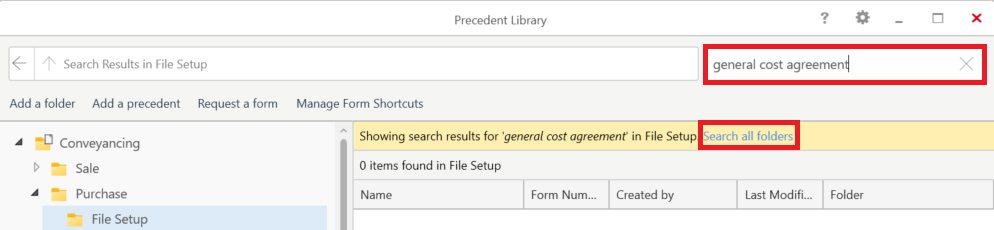 However, if you need to access this precedent in all areas of law, you may be better off using the Search Bar to take you to the original (using this method means you don't have to create multiple short cuts). Search for your precedent by typing the name of the precedent in the Search Bar and select Search all folders: