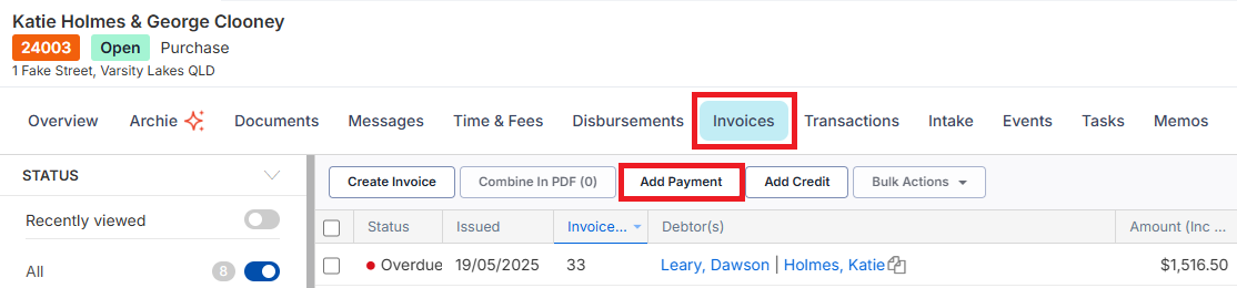 2. Select the Invoices tab and then select Add Payment.