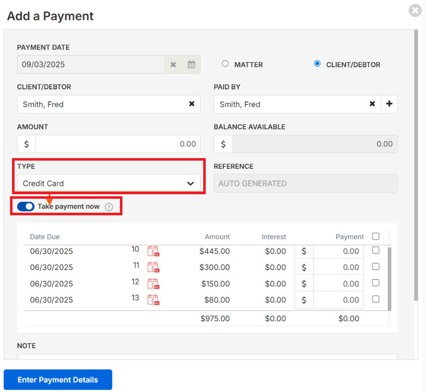 3. Select Credit Card from the Type dropdown menu and toggle on Take Payment Now.