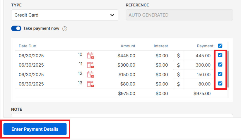 4. Use the checkboxes to select which invoices will receive payments and select Enter Payment Details.