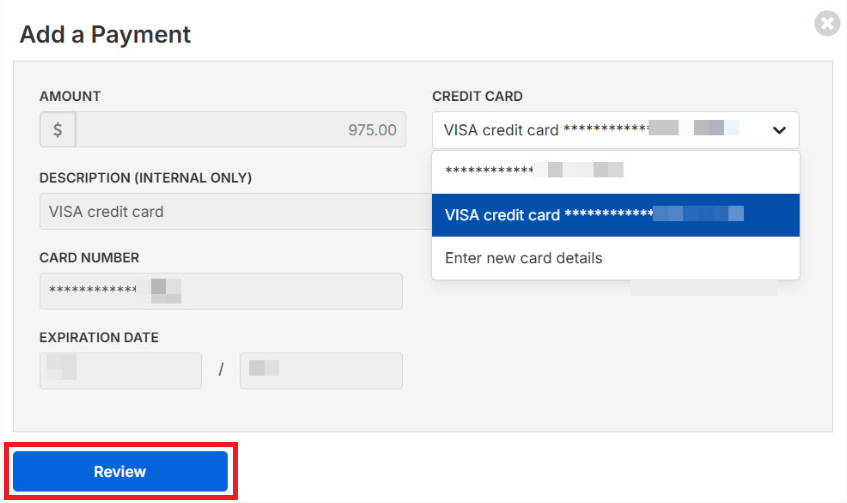5. Choose a credit card or enter new credit card details and select Review.