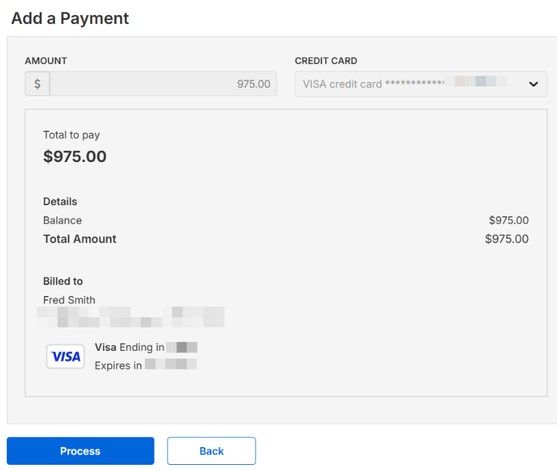 6. Confirm the payment amount and billing details, then select Process.