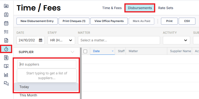 1.    Select Time/Fees from the left menu and then select the Disbursements tab.