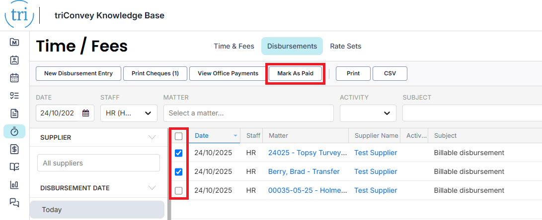 4.    Tick the relevant disbursements listed on the page, then select Mark As Paid from the top bar.