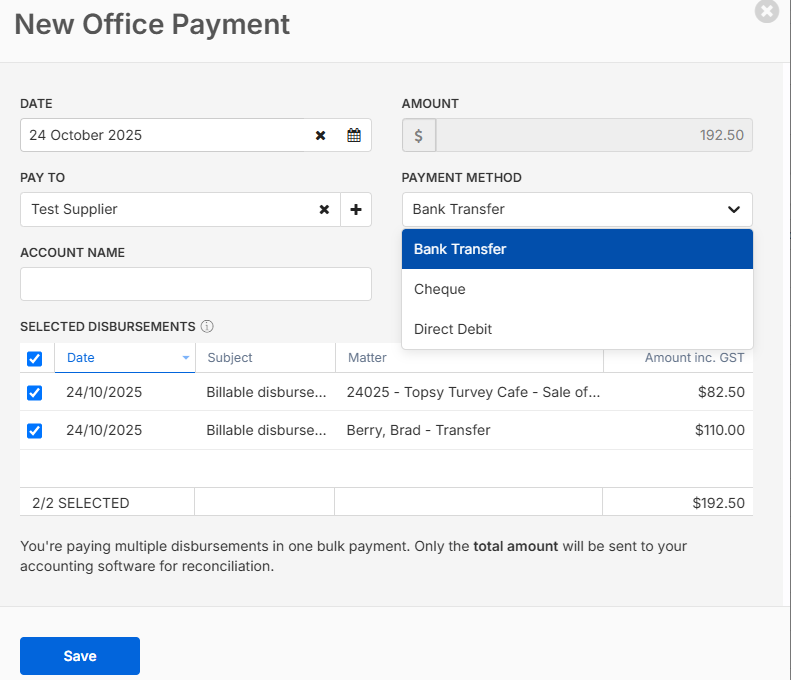 5.    The New Office Payment window will open. Enter the payment method (Bank Transfer, Cheque or Direct Debit) and other relevant details.