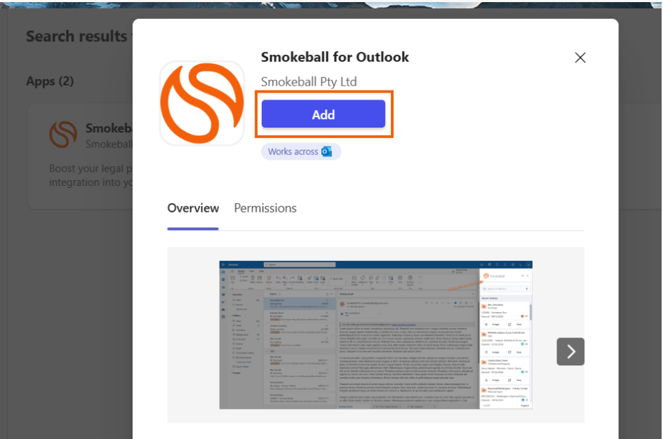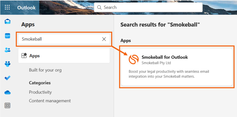3.    Search for Smokeball in the search bar and click on "Smokeball for Outlook".
