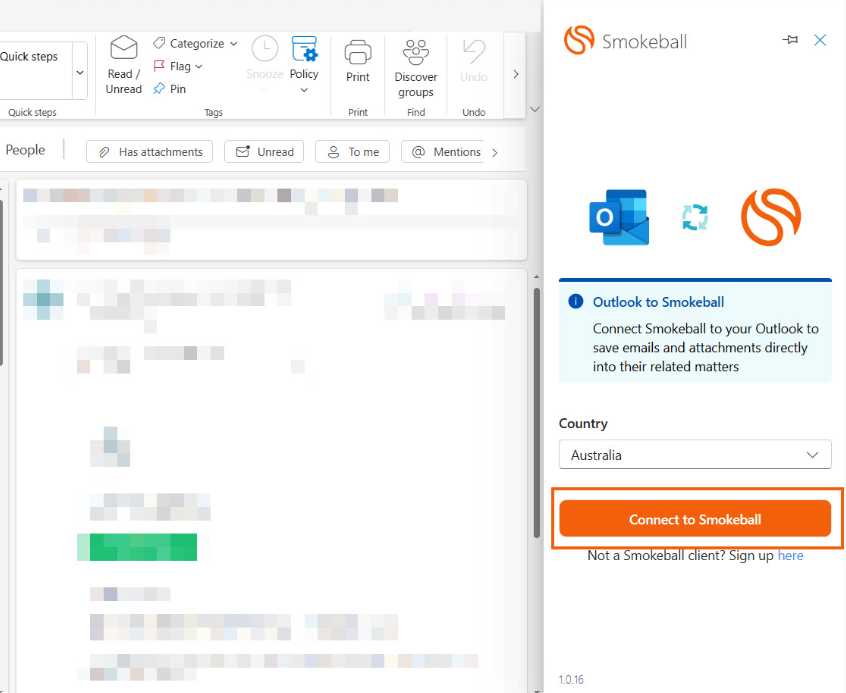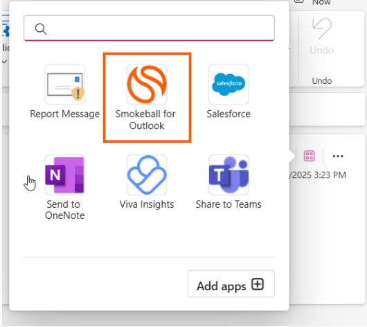 7.    Select Smokeball for Outlook. The Smokeball toolbar will appear from the right-hand side of the screen.
