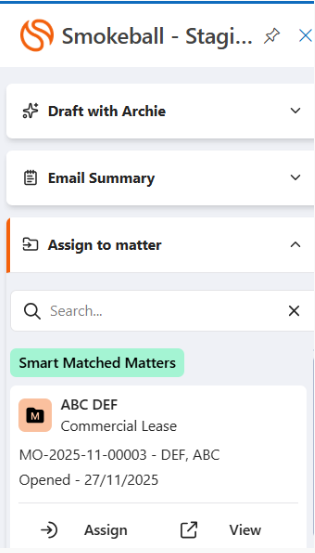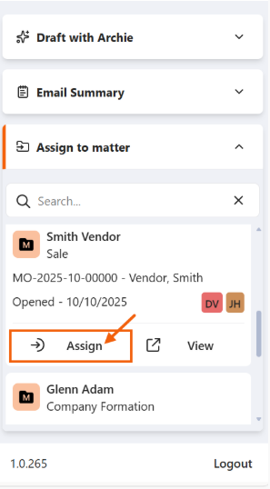 1.    To save an email to a matter, click on the Assign to matter section and select Assign under a relevant matter.