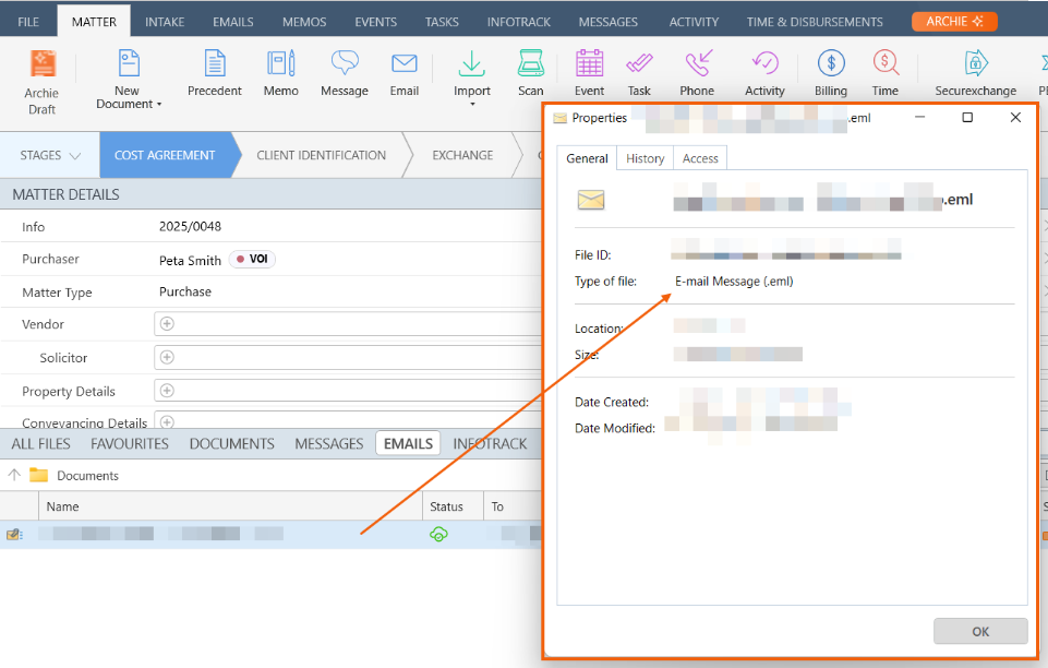 3.    Once assigned, the email will then appear in the Emails tab of the matter, as an .eml file.