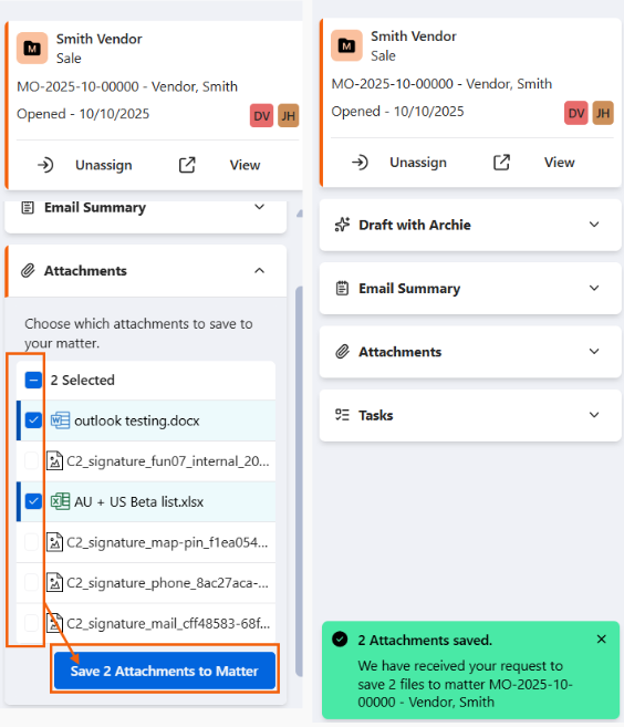 Tip:  When attachments are selected and saved to a matter, they are successfully stored. However, upon re-checking, the UI may display them as not attached. This is a Microsoft limitation.