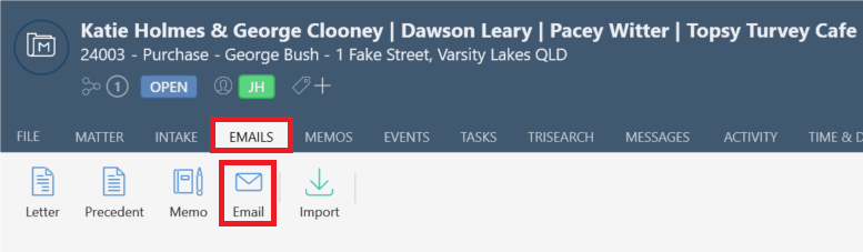 1.    From your matter, navigate to the Emails tab and select the Email icon.
