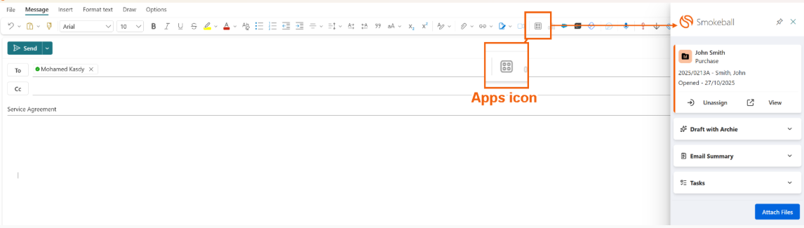 4.    Select Apps from the toolbar, then select Smokeball for Outlook again to display the Smokeball toolbar. This is where you can view the matter that this email will save to, and also attach any files from the matter to your email.