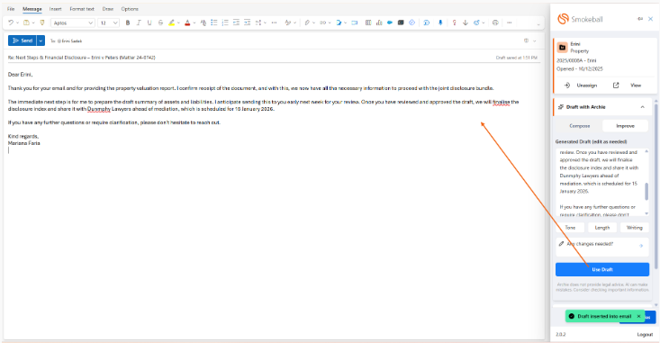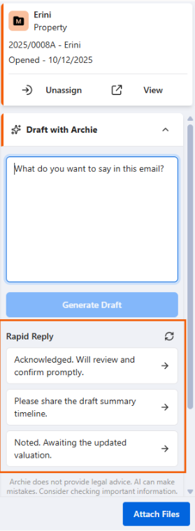 • If you have Archie enabled, you can select a Rapid Reply or Draft with Archie from the Smokeball toolbar.