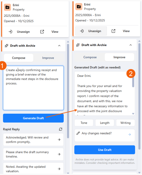 • Use Draft with Archie to enter a prompt for Archie AI to work with when generating a draft email.