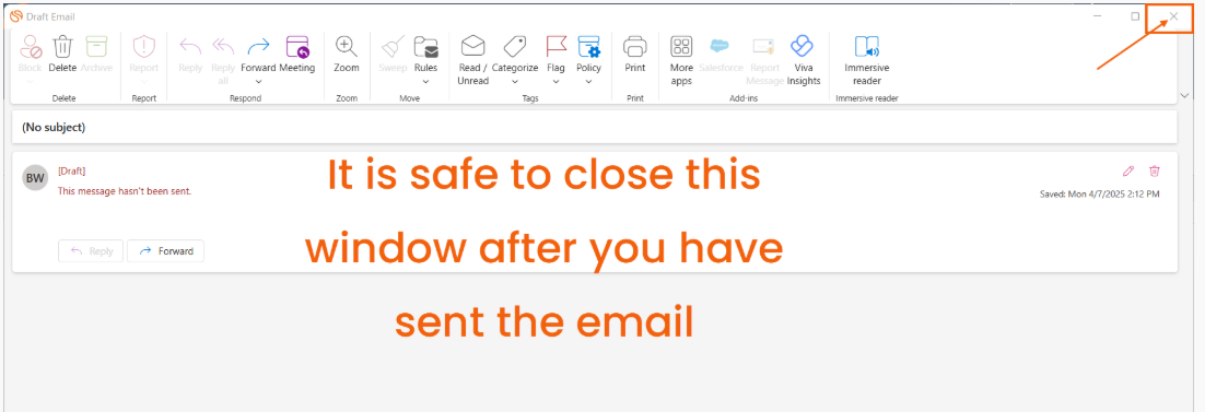 Tip:  You will be redirected to the New Draft Email window after sending. This is expected behavior and it is safe to close that window at this point. If you don't close the window, it will automatically close after a few seconds. Disregard the "[Draft] This message hasn't been sent." messaging.