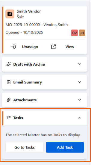 The Tasks section in the Smokeball toolbar shows the top six upcoming tasks related to the matter. From this screen, you can also add a new task: