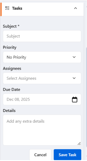 2.    Enter the details of the task. The Subject field is mandatory, while all other fields are optional.