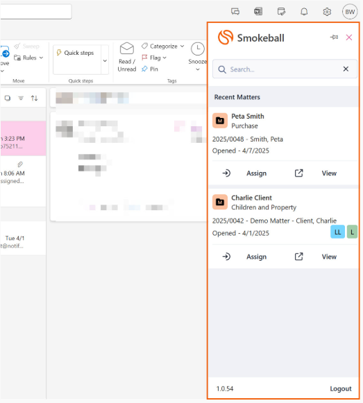 10.    Once you have logged in successfully, the Smokeball for Outlook toolbar will appear on the right-hand side. This is where your most recently worked on matters in triConvey will appear.