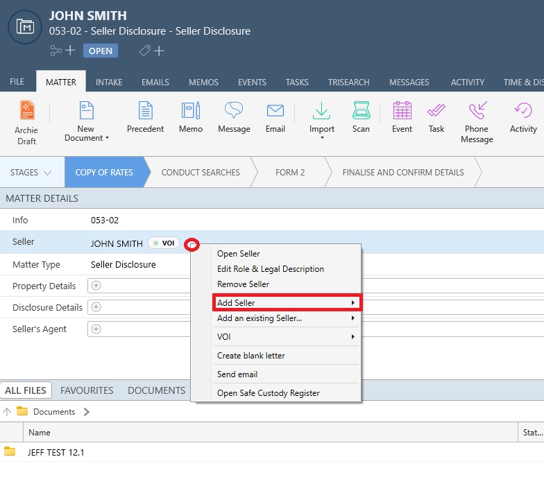 Tip: To add an additional Seller, right click on Seller, select Add Seller and then choose from Same Solicitor or Different Solicitor.