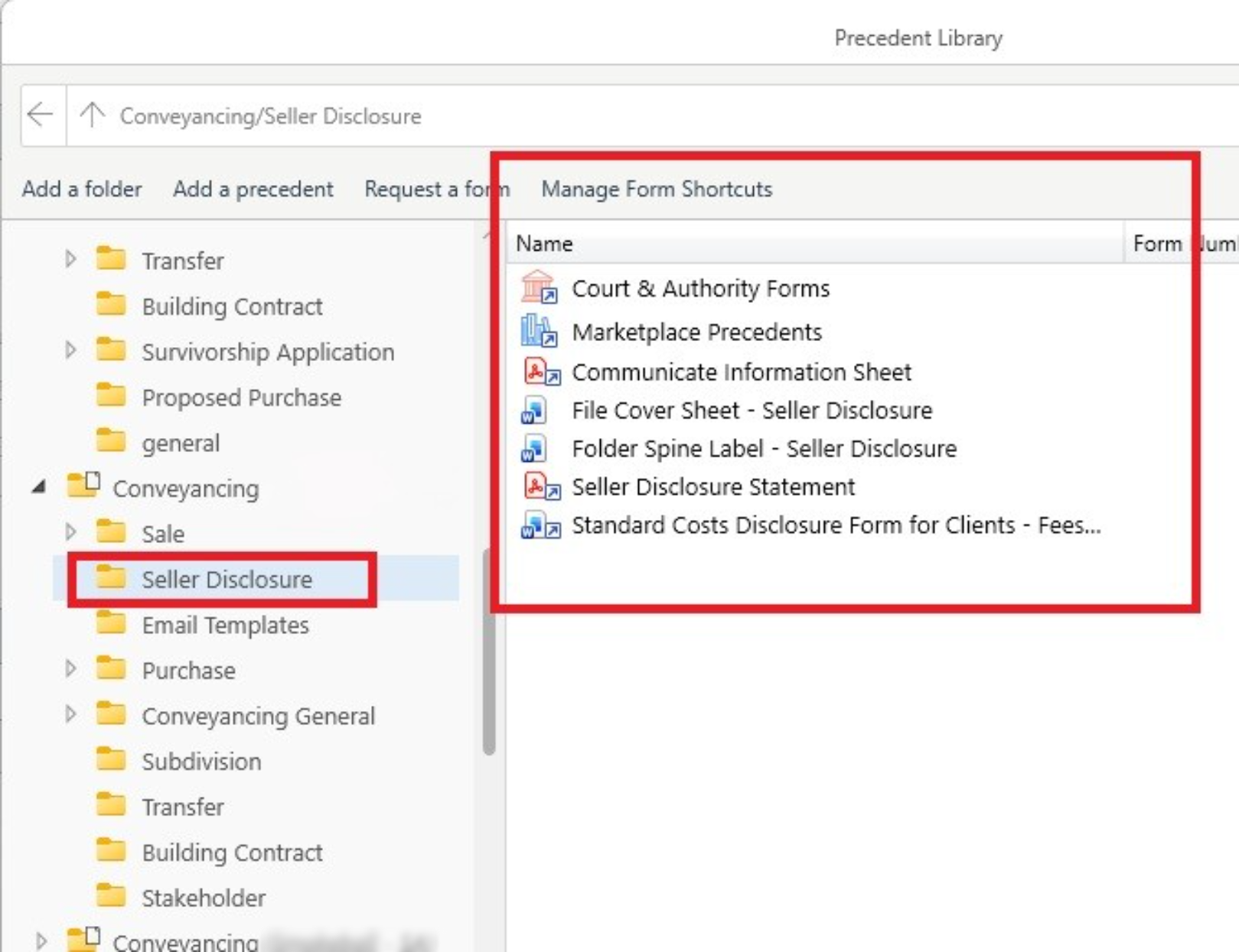 The Seller Disclosure matter provides access to the Conveyancing (QLD) Precedent Profile with pre-set Precedent Library folders which include non-legally drafted precedents for everyday use, together with shortcuts to commonly used documents found under Court & Authority forms.